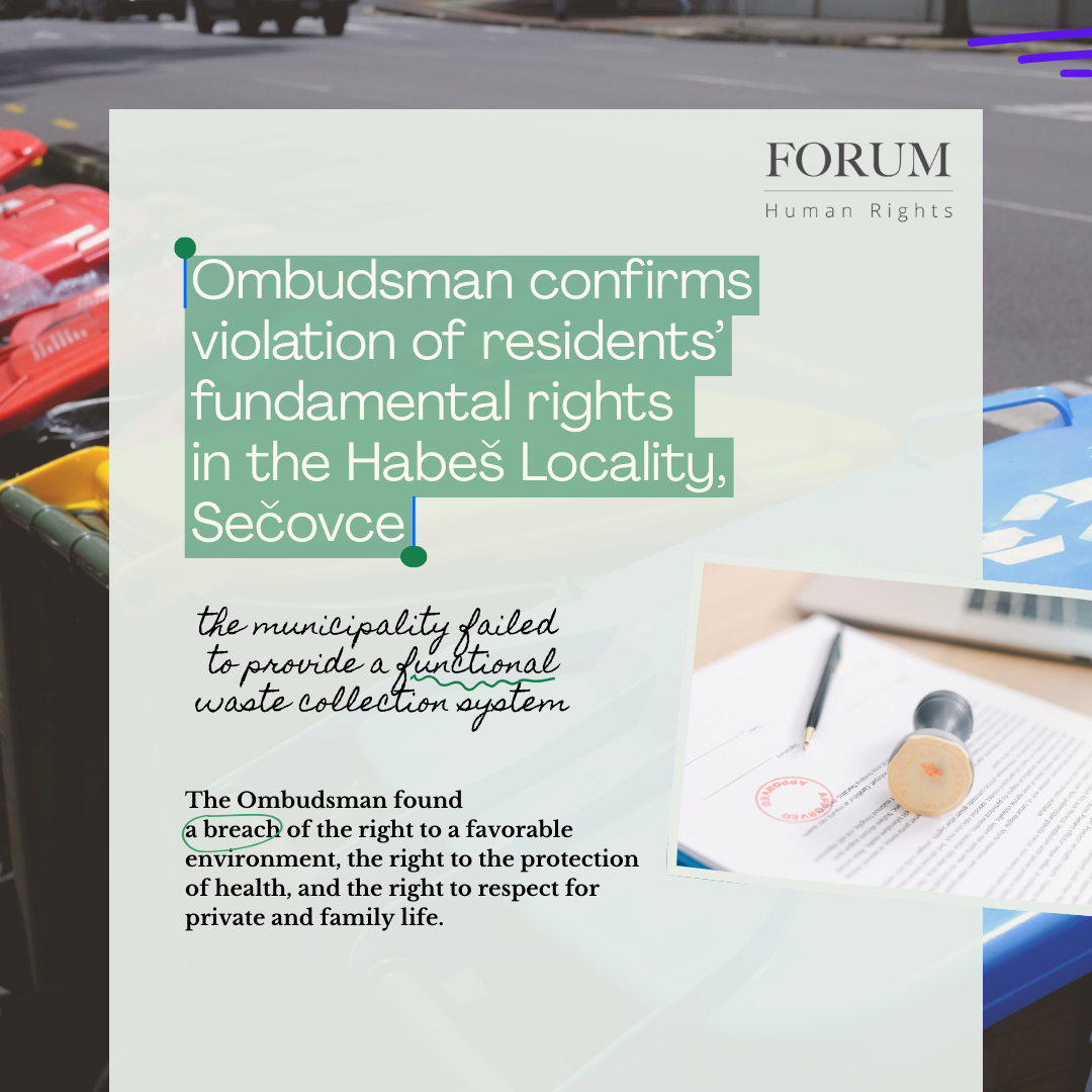 During fieldwork and based on publicly available information, we found that in the Habeš locality there has been long-term accumulation of municipal waste in the immediate vicinity of the homes of a segregated Roma community. The area lacks systematic waste collection measures – only three large-capacity containers serve the entire locality, they are emptied irregularly, and the functioning of the system …